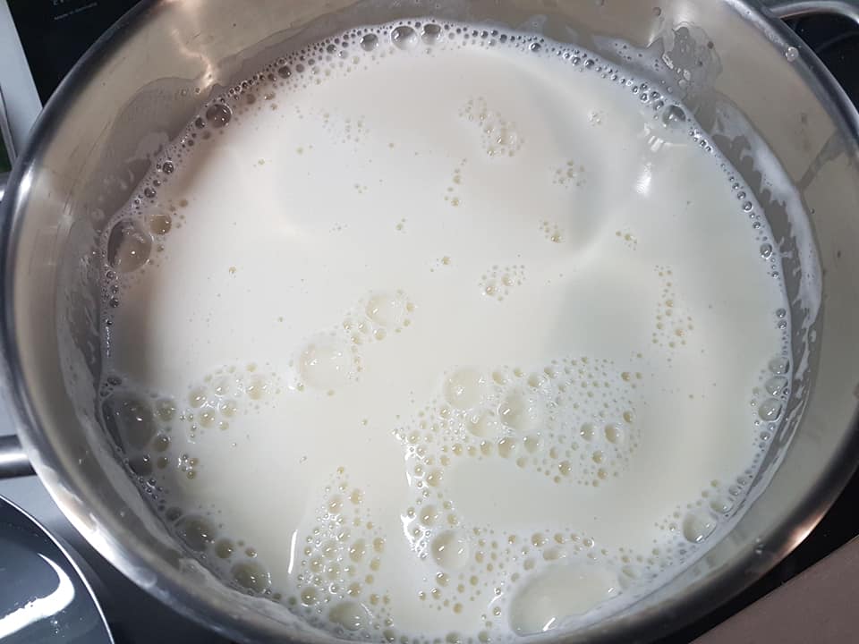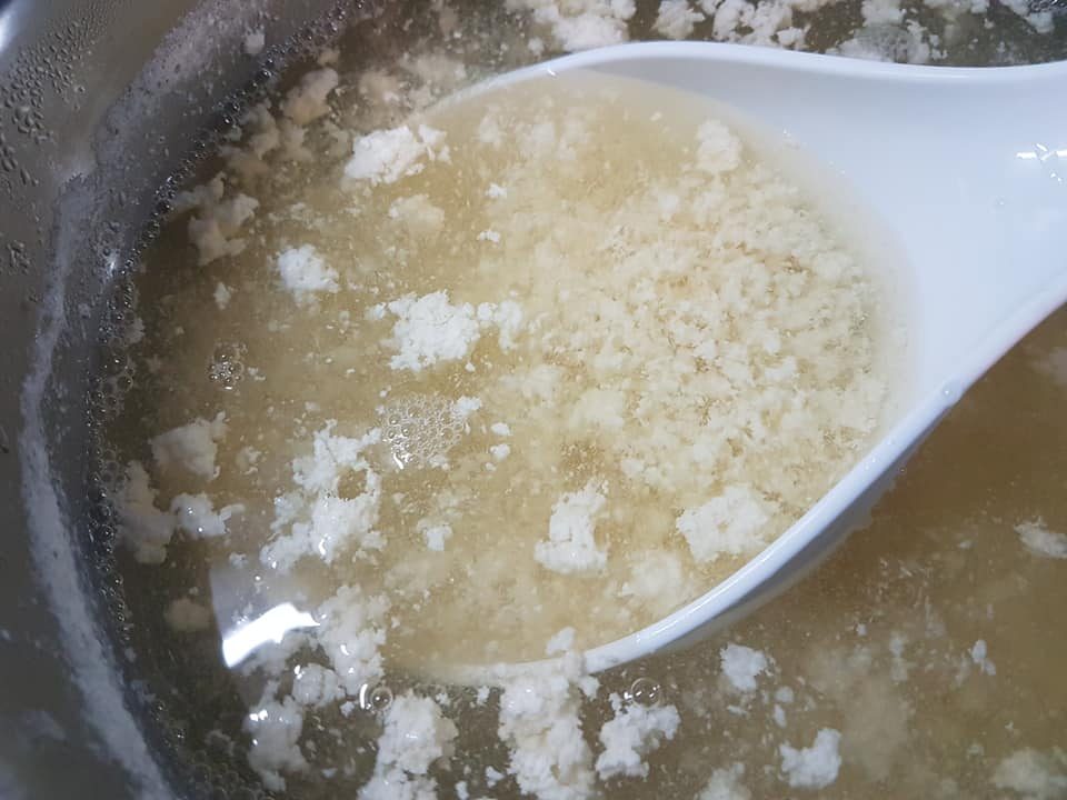 Na tym etapie przygotujcie sobie ok. zimnej 500 ml wody. A także rozpuście 50ml octu w szklance wody. Uzbrojeni w ten sposób możecie zacząć grzać „mleko”. Stopniowo, na średnim ogniu, mieszając. Są dwa problemy – białko sojowe może łatwo się przypalić na dnie garnka oraz może szybko wykipieć. Zagotowujemy nasz płyn – zacznie podnosić się piana. Dolewamy zimnej wody by obniżyć temperaturę. Zdejmujemy pianę łyżką i podgrzewamy do ok. 90*C (od razu zrozumiecie, że znowu zaczyna się podgotowywać – zaczną małe bąbelki iść). Obniżamy ogień by nie dopuścić do zagotowania i stopniowo dodajemy nasz roztwór octu. Łyżka po łyżce. Po każdej łyżce mieszamy i obserwujemy „skrzep”. Interesuje nas konsystencja jak na zdjęciu – białko się zwarzyło, a pozostały płyn jest całkiem przejrzysty.