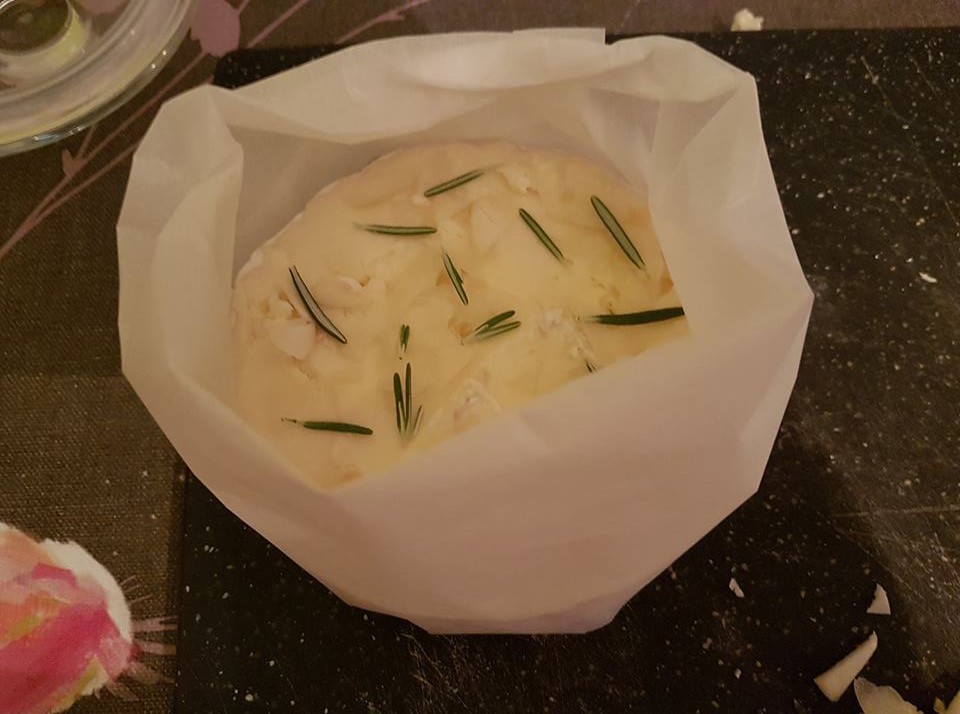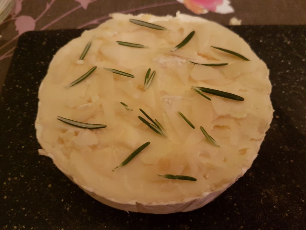 Cienko odciąć górną część sera. Położyć z wierzchu pokrojony w cienkie paski ząbek czosnku oraz listki rozmarynu.