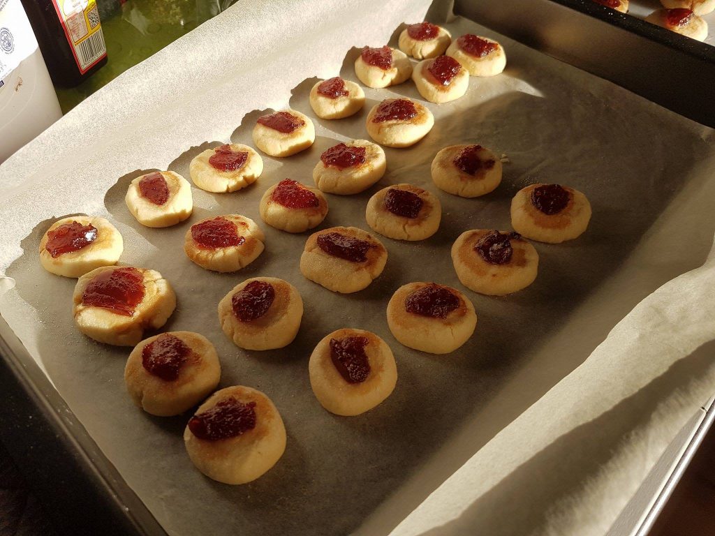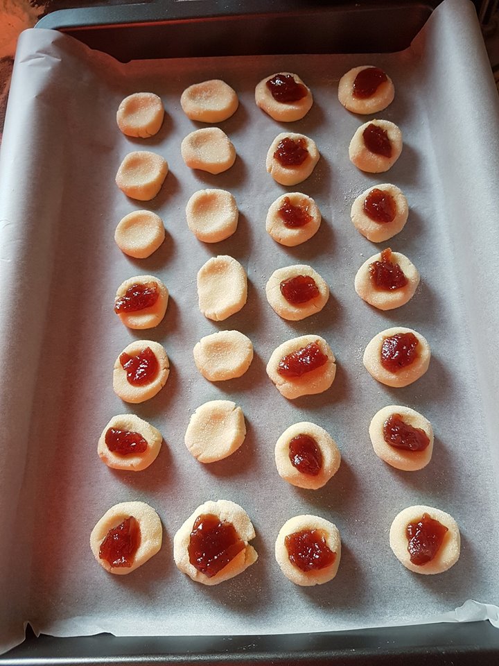 Maczać ciasteczka z jednej strony w cukrze. Ja użyłem cukru drobnoziarnistego do dekoracji ciast i wypieków. Kładziemy na tę stronę odrobinę marmolady (najlepiej domowej, ale ja użyłem gotowej wieloowocowej). Można by było użyć też powideł – ale parę razy próbowałem i mi się powidła rozlewały.