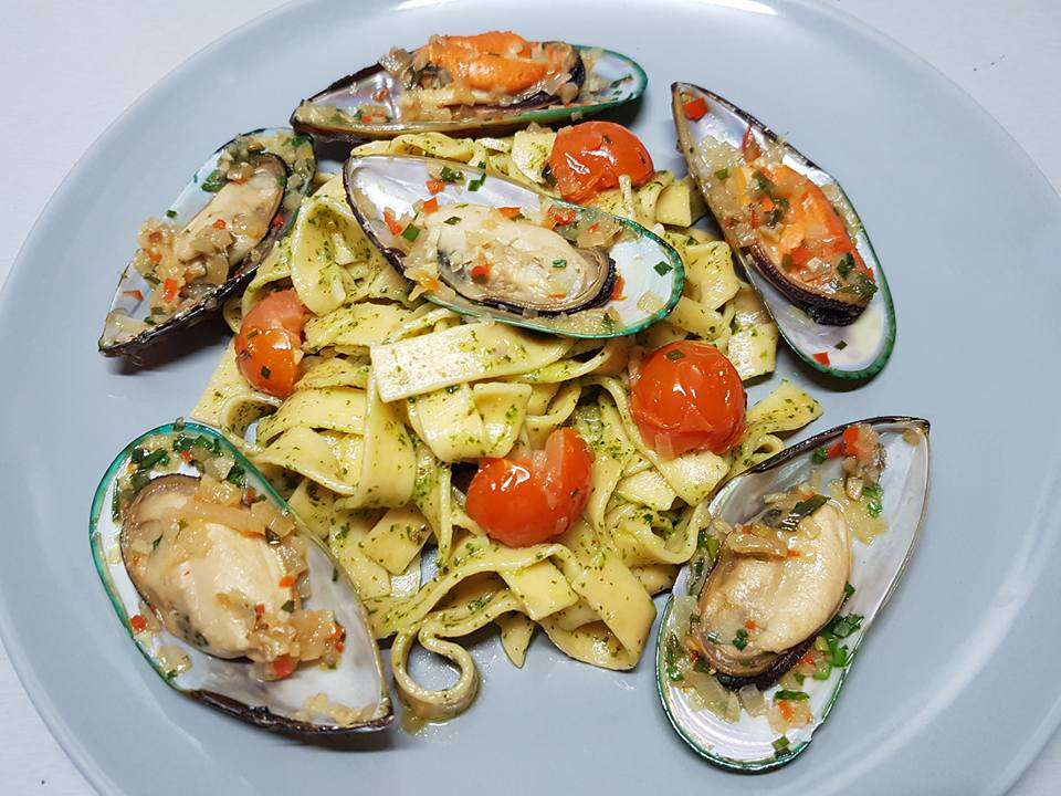 Mieszamy odsączone tagliatelle z pesto tak by sos pokrył cały makaron. Wykładamy go na talerz i dodajemy małże i pomidorki. Na małże możemy wyłożyć usmażoną cebulkę z chili i podlać je pysznym, zredukowanym sosem.