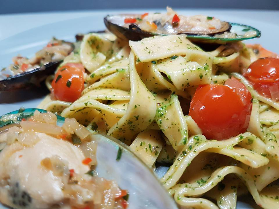 Od dłuższego czasu chciałem przygotować jakiś fajny makaron. Wreszcie nadarzała się dobra okazja – Walentynki! Duże myślałem nad zrobieniem domowego pesto. Tylko nie chciałem robić tradycyjnego pesto z samej bazylii. Chciałem, by moje pesto było świeże w smaku i bardzo aromatyczne. Dlatego zrobiłem pesto bazyliowo-miętowe. Do tego miałem pyszne nowozelandzkie małże zielone, które stwierdziłem, że podam w sposób mniej więcej tradycyjny – z cebulką, chili i czosnkiem – uduszone w cydrze. Wyszło kolorowe i aromatyczne danie w sam raz na kolację we dwoje.
